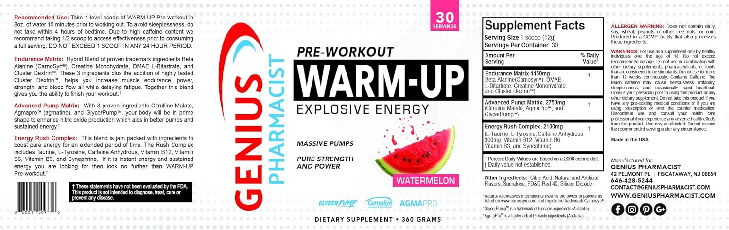 Genius Pharmacist PRE-Workout Warm-UP Explosive Energy Watermelon – 360 Grams